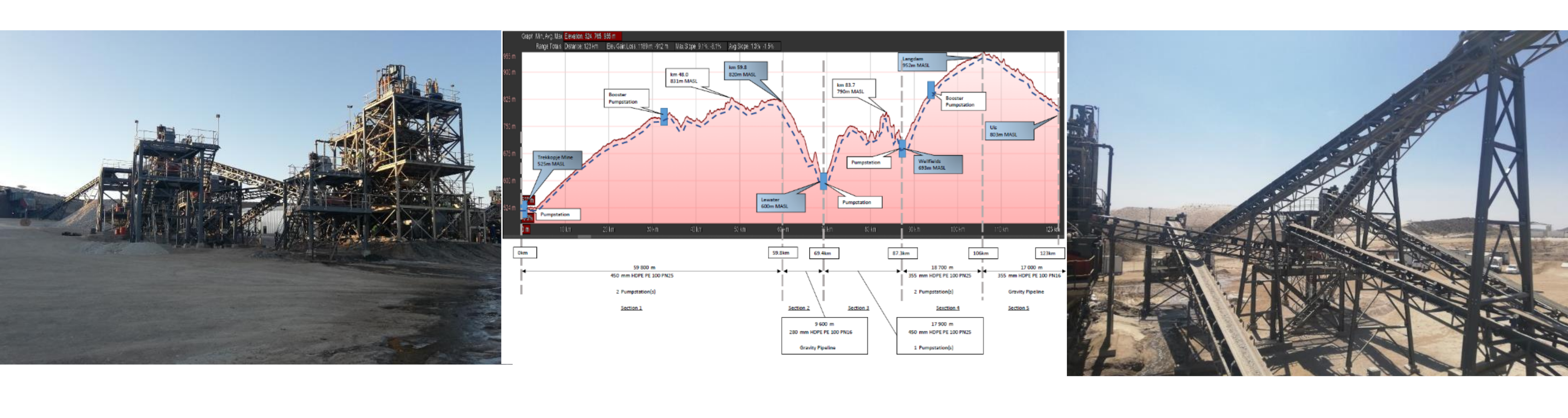 Phase 2 also included the design of bulk supply pipeline and pump system, to pump treated seawater from the Erongo Desalination Plant (near Swakopmund, Namibia) to the UIS Phase 2 Project, at UIS, Namibia. The total length of the pipeline is approximately 123km, including five pumpstations. The static head of the pipeline system is in excess of 425m.